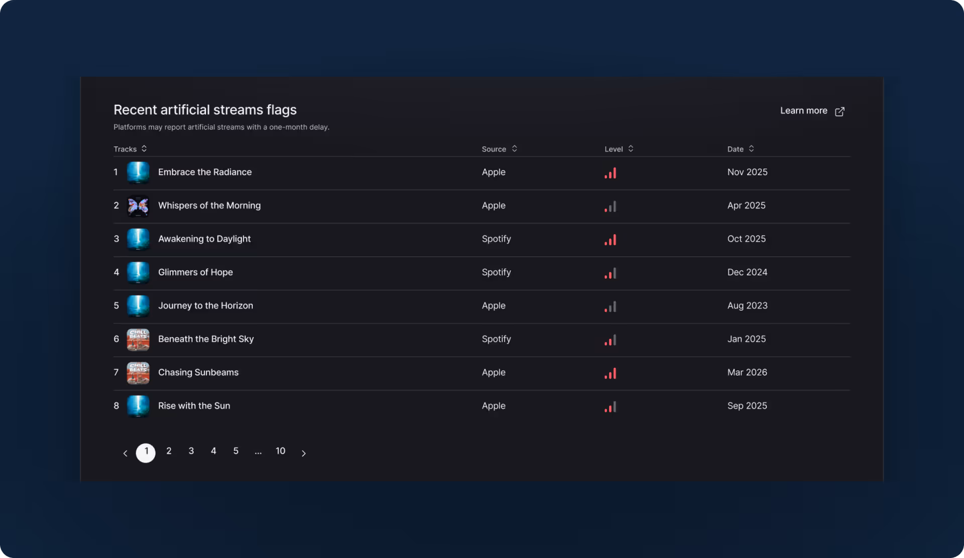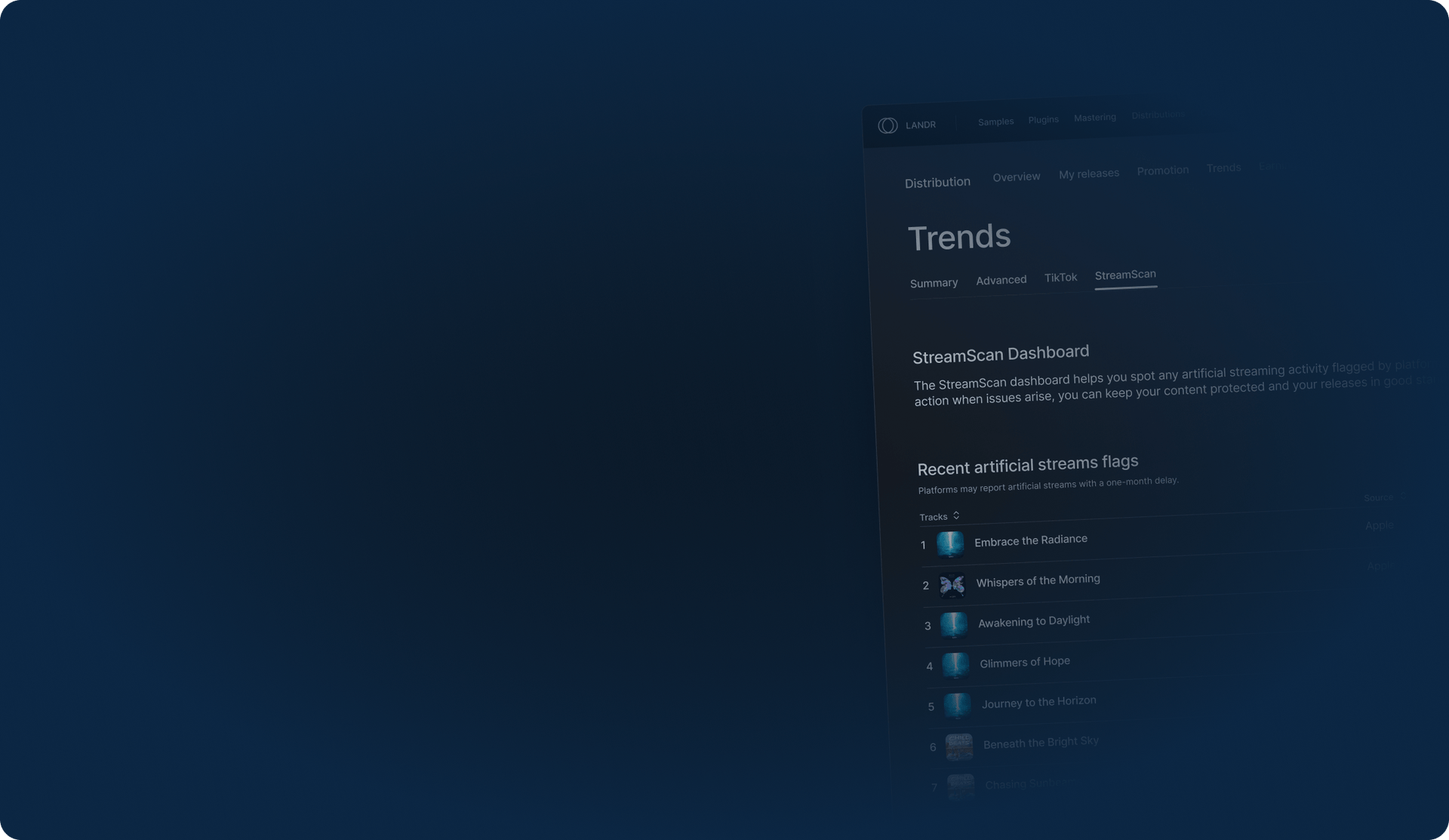 LANDR helps artists and labels stay informed about artificial streaming activity, giving them the tools to protect their music and maintain streaming integrity.