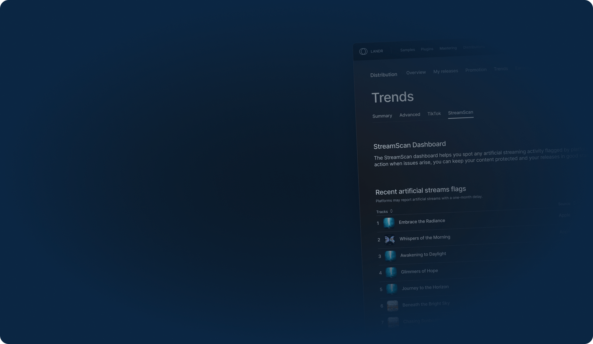 Each month, LANDR aggregates verified reports from major DSPs such as Spotify and Apple Music that identify releases showing signs of artificial streaming and displays those flags in the StreamScan dashboard.