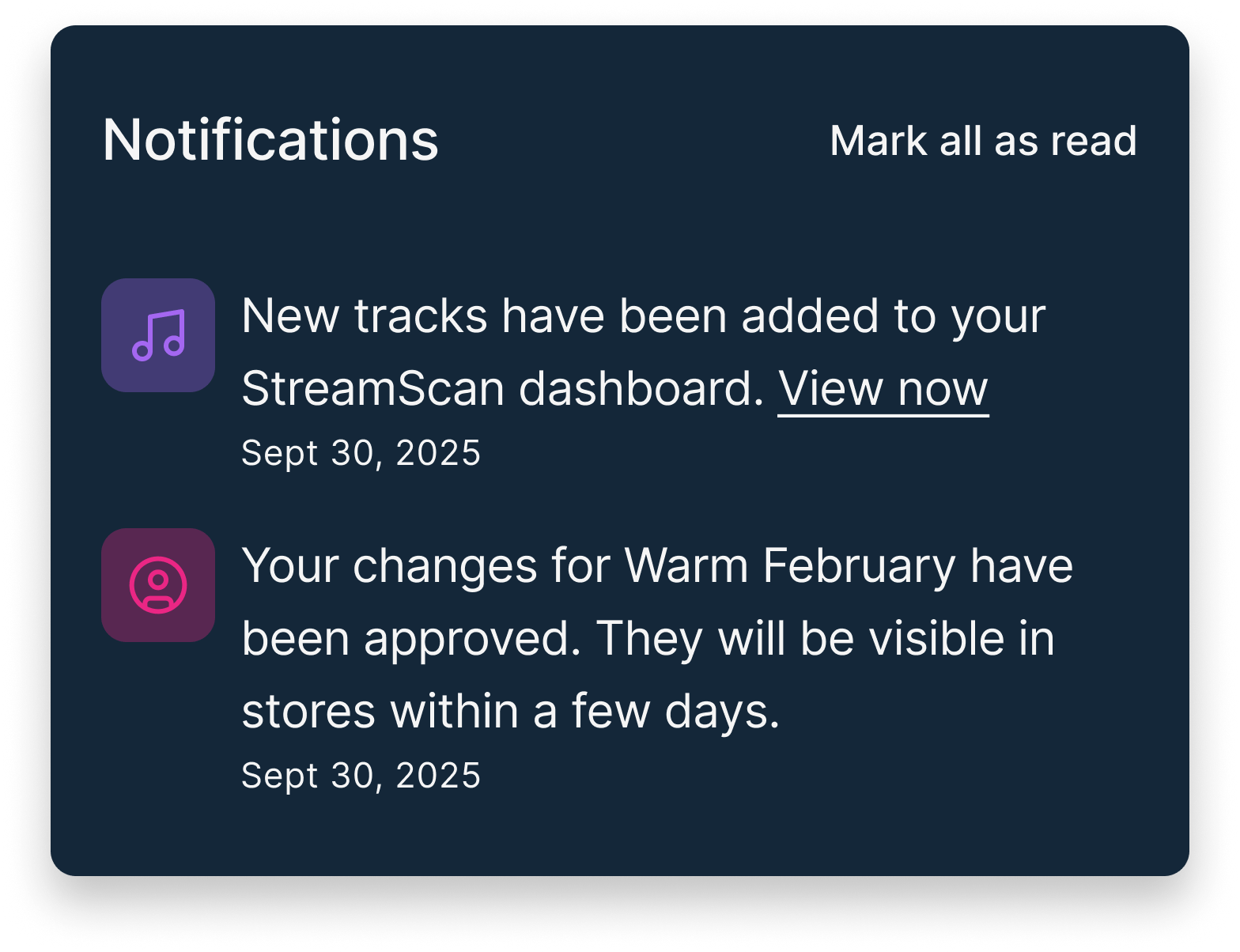 Not at this time. StreamScan notifications appear on the LANDR website, and you’ll also receive updates by email.