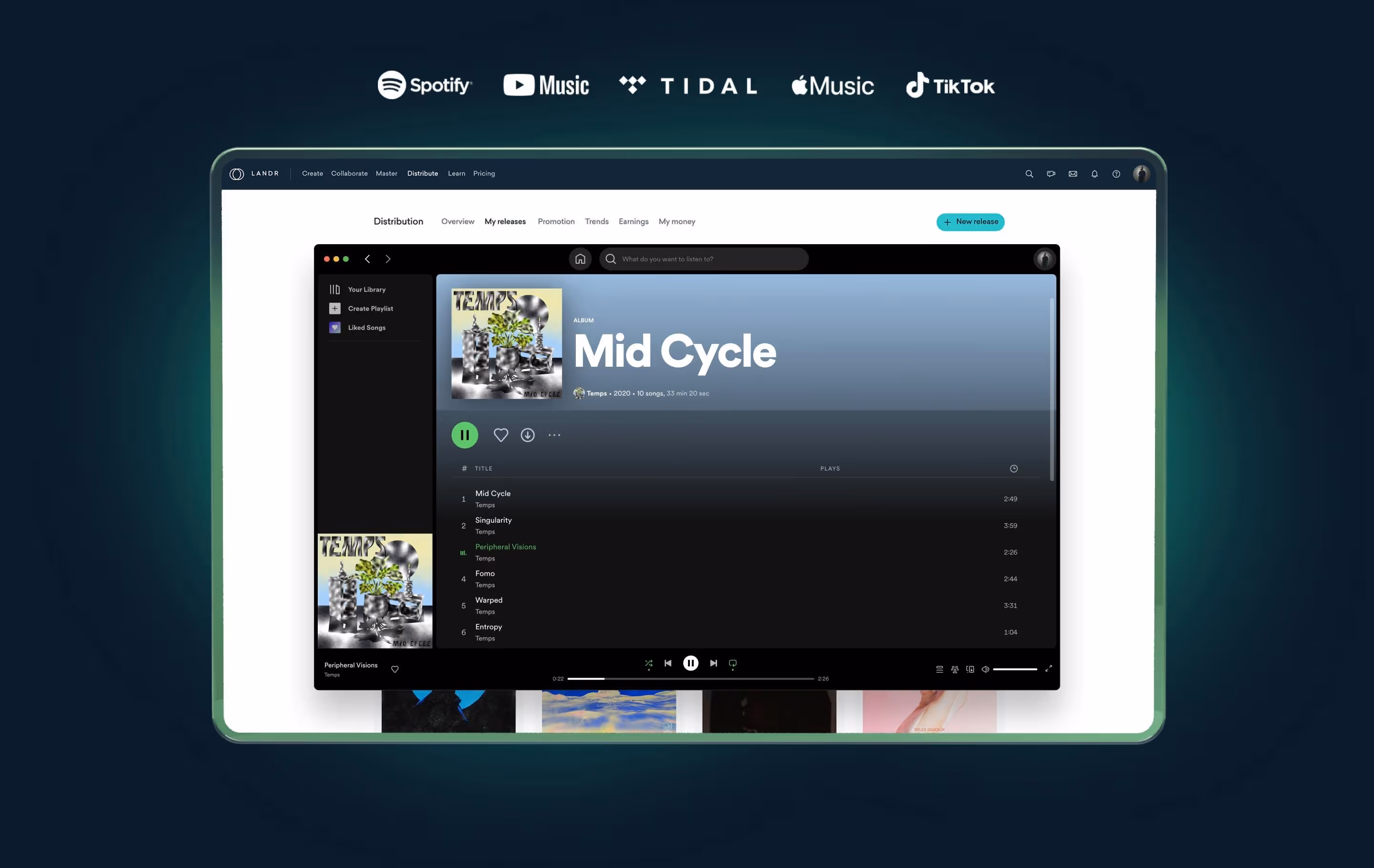 Lorsque vous distribuez via LANDR Distribution, votre musique est livrée sur plus de 150 plateformes de streaming, plateformes de réseaux sociaux et plateformes, y compris Spotify, Apple Music, Amazon Music, Tidal, TikTok, YouTube et plus encore. C'est le meilleur moyen de faire entendre votre musique par des auditeurs du monde entier.
