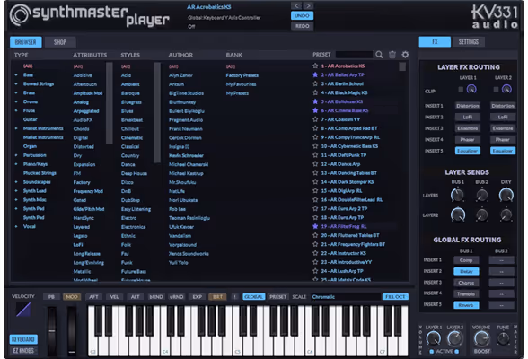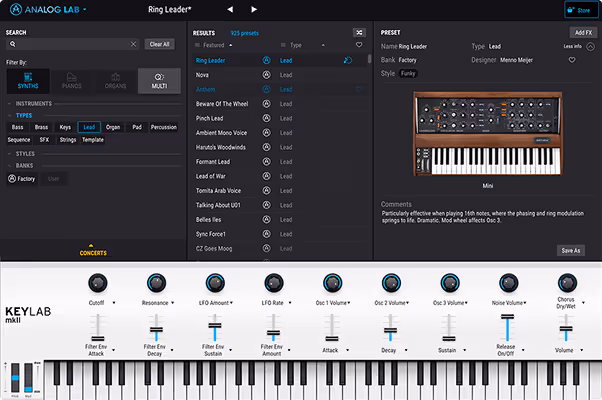 何百もの刺激的なキーボードプリセットでシンセレジェンドになろう。 23種の楽器とArturiaのTrue Analog Emulation®を搭載。
