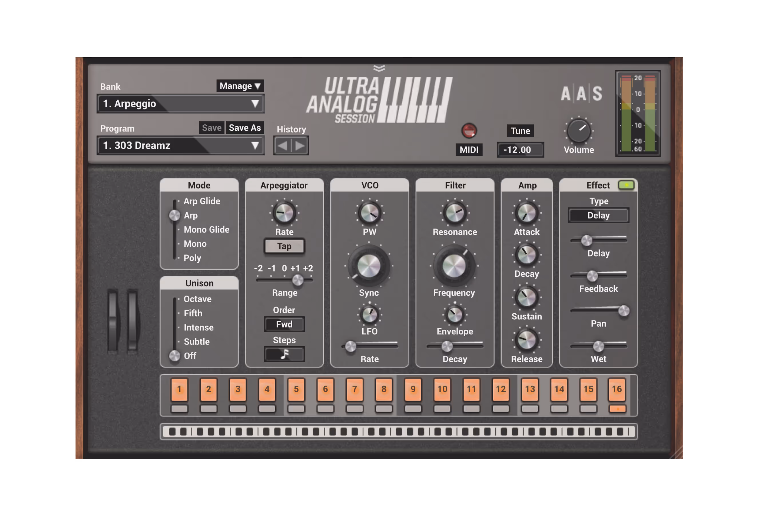 144種類のプリセット、内蔵エフェクト、アルペジエーターを備えたアナログシンセエミュレーション