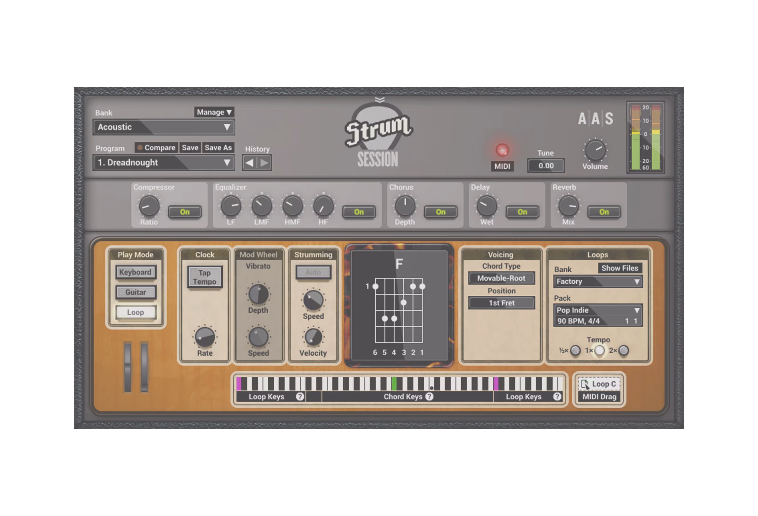 使いやすいギターシンセで、トラックに6弦の魅力を加えよう。 アコースティックとエレクトリックサウンド、内蔵エフェクト、コード認識、700種類のストラミングループなどを手に入れよう。