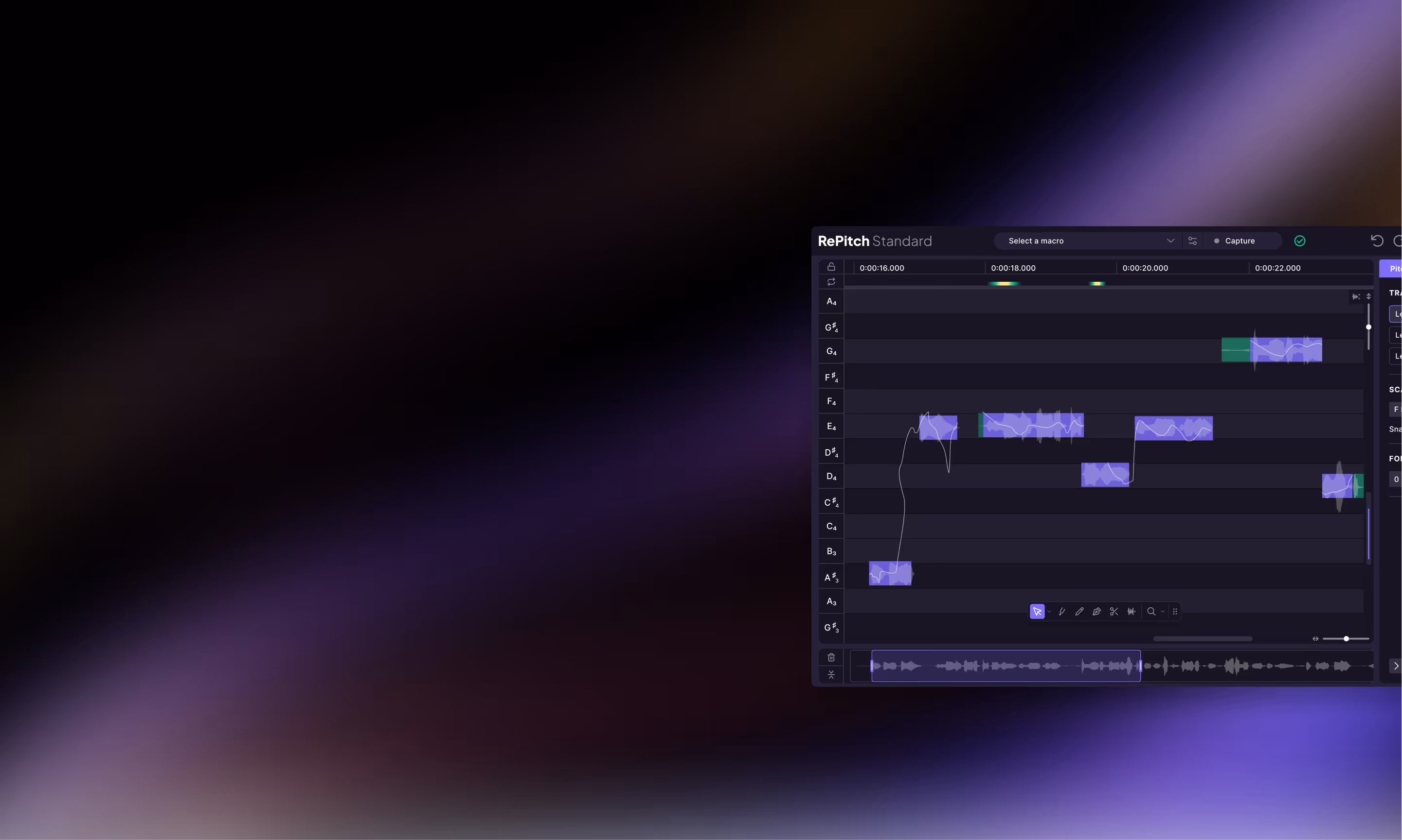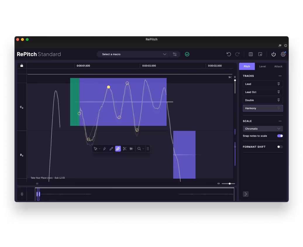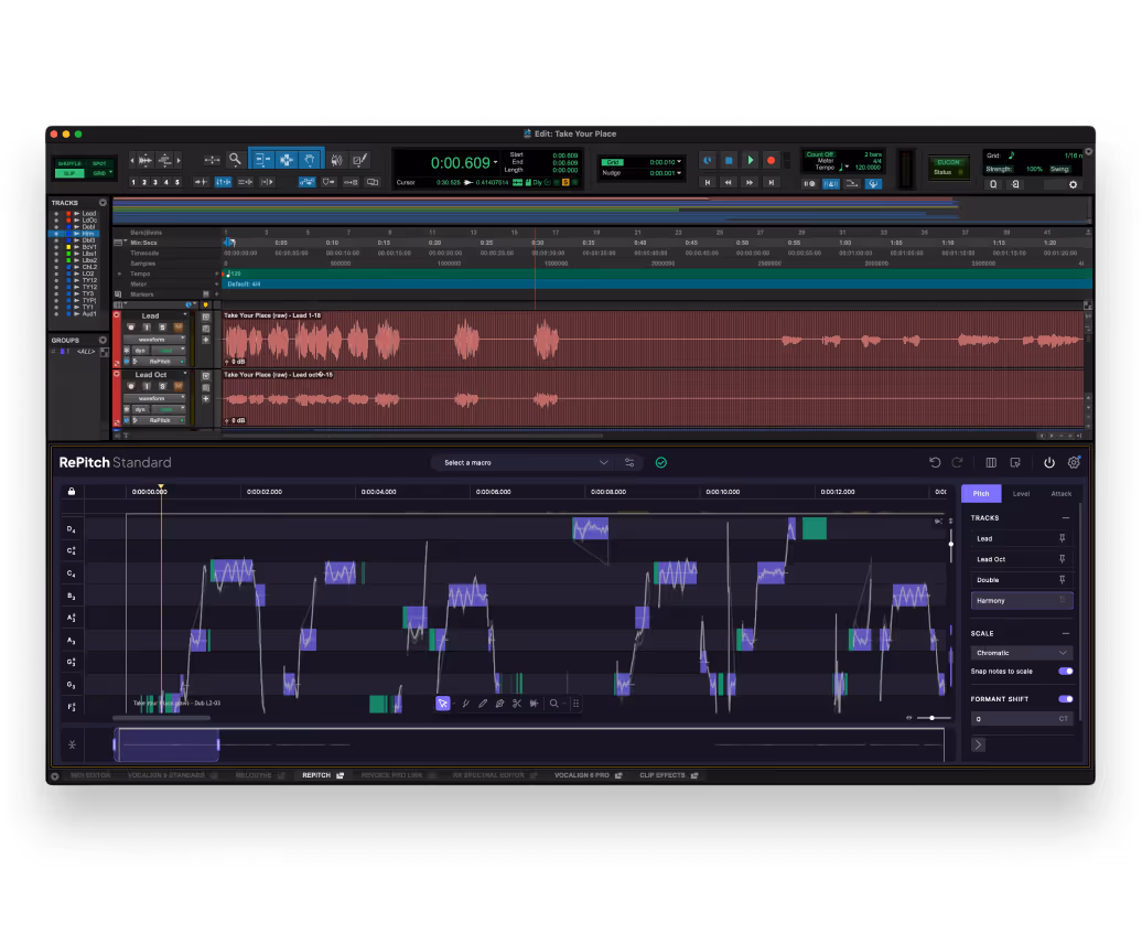RePitch はピッチから歯擦音まで、ボーカルのあらゆるニュアンスを解析し、編集結果をよりスムーズで自然に聴かせるための正確なデータを提供します。