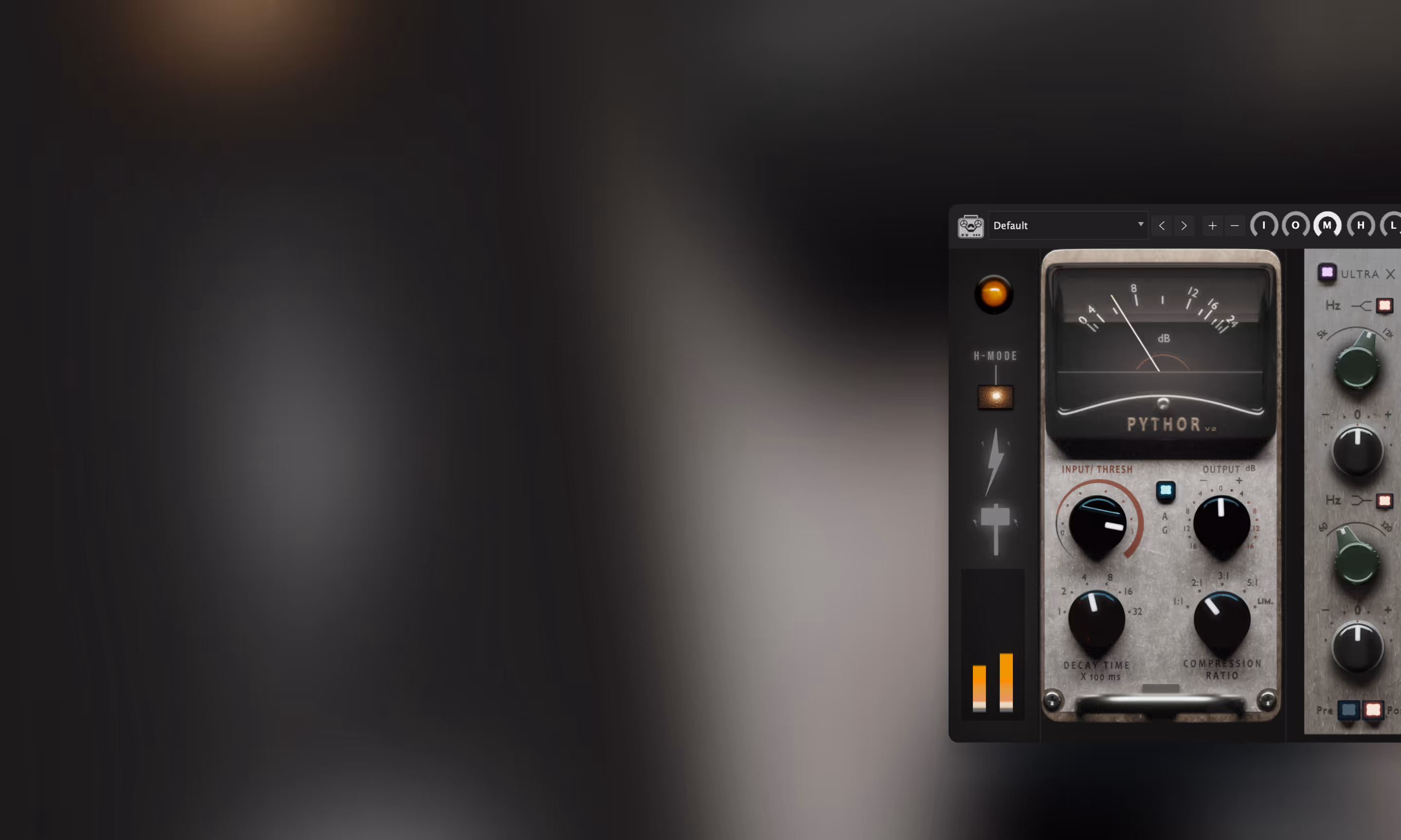 Shape your compression response with Pythor’s input-driven gain reduction, variable decay times, and adjustable ratio. Tighten transients with faster decay or add sustain with slower settings, while pushing the input lets you move from subtle squeeze to aggressive limiting.