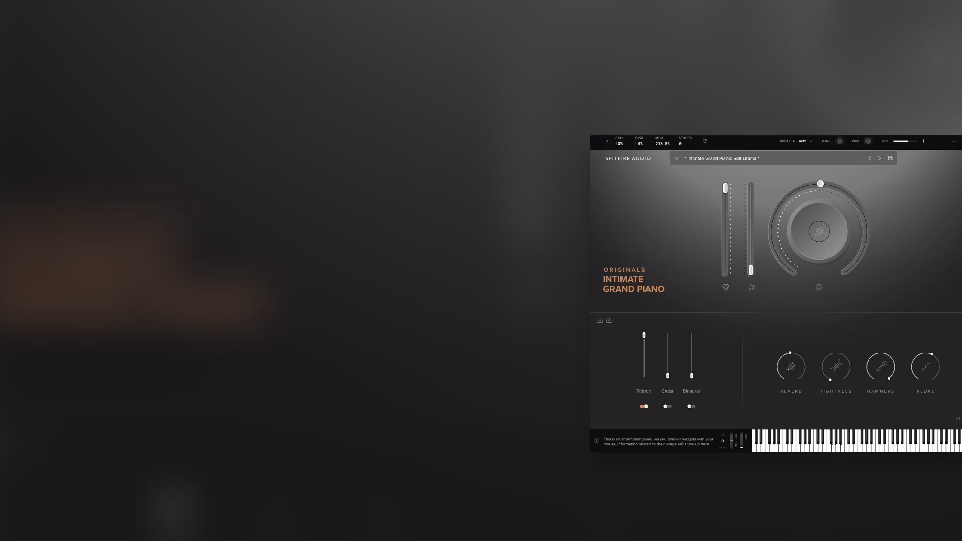 Find the precise piano sound you’re looking for with 8 presets ranging from bright to dark and cinematic and a range of custom controls for reverb, hammers, tightness, and pedal.