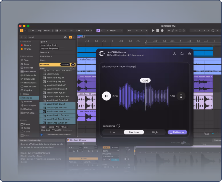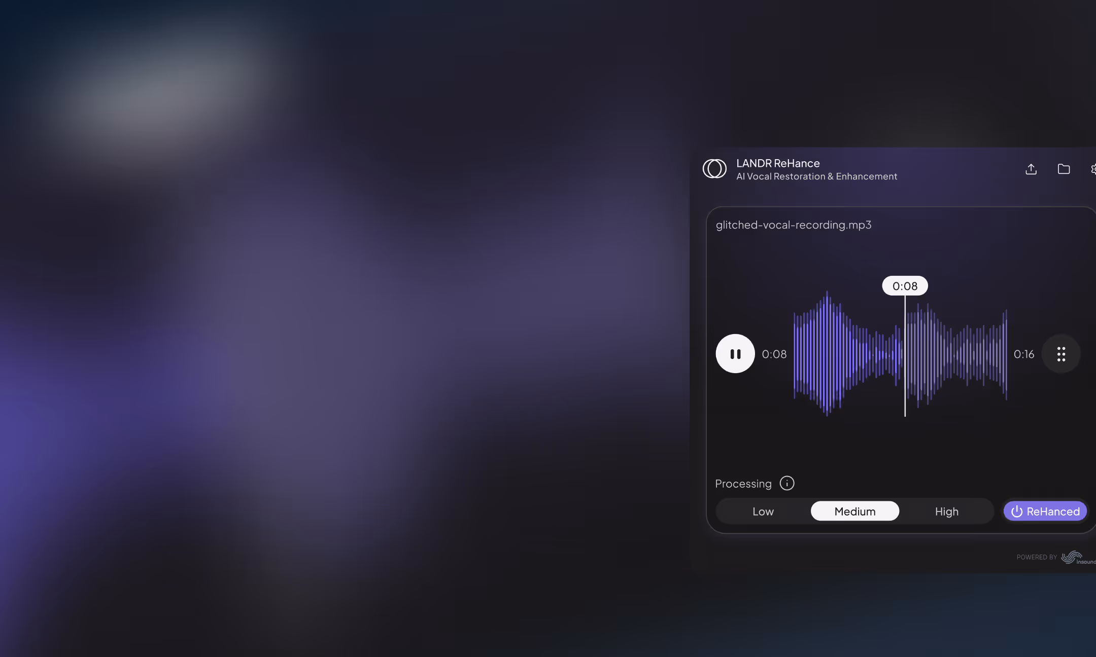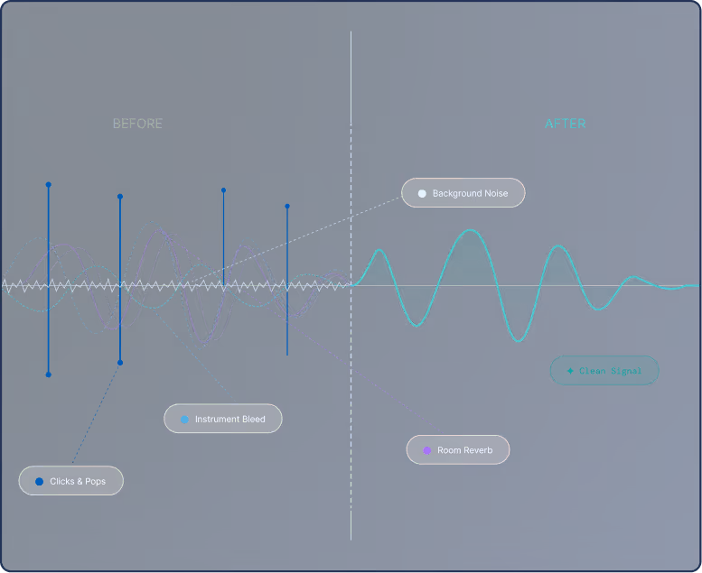 LANDR ReHance™ não aplica apenas um filtro estático, ele ouve sua faixa de áudio para distinguir entre a performance principal e o ruído de fundo ao redor, criando um perfil de restauração personalizado.